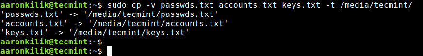 sudo cp -v passwds.txt accounts.txt keys.txt -t /media/tecmint/