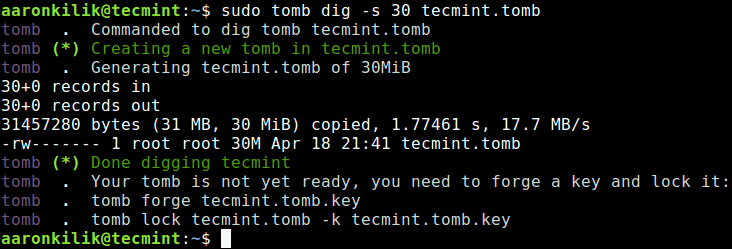 sudo tomb dig -s 30 tecmint.tomb