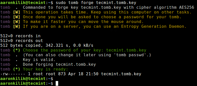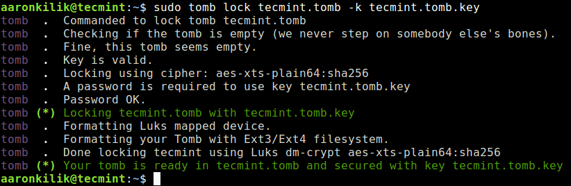 sudo tomb lock tecmint.tomb -k tecmint.tomb.key