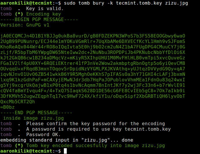 sudo tomb bury -k tecmint.tomb.key zizu.jpg