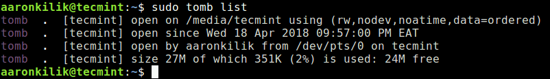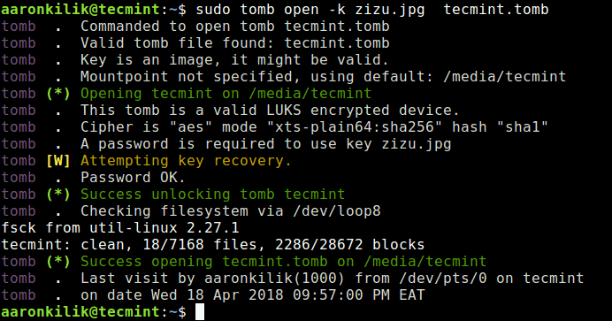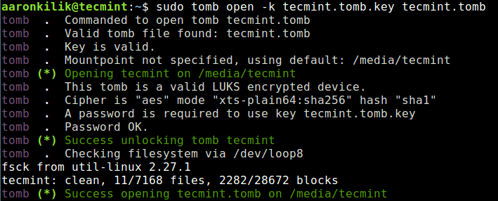 sudo tomb open -k tecmint.tomb.key tecmint.tomb