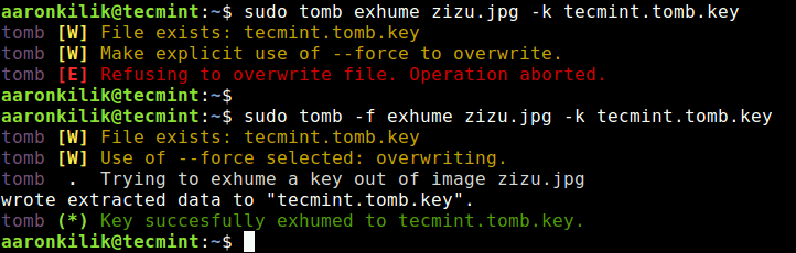 sudo tomb -f exhume zizu.jpg -k tecmint.tomb.key #force operation if key exists in current directory