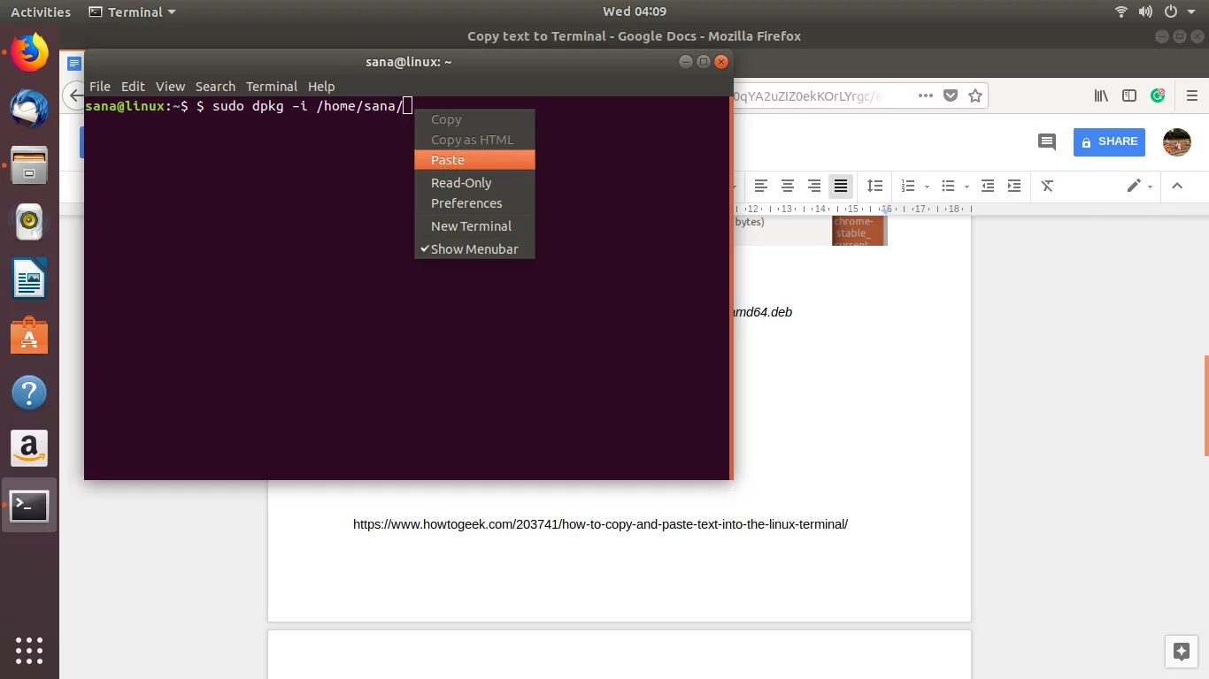 您可以简单地从本教程中复制该命令,然后通过右键单击然后从菜单中选择“粘贴”将其粘贴到终端中,而无需重新键入该命令。