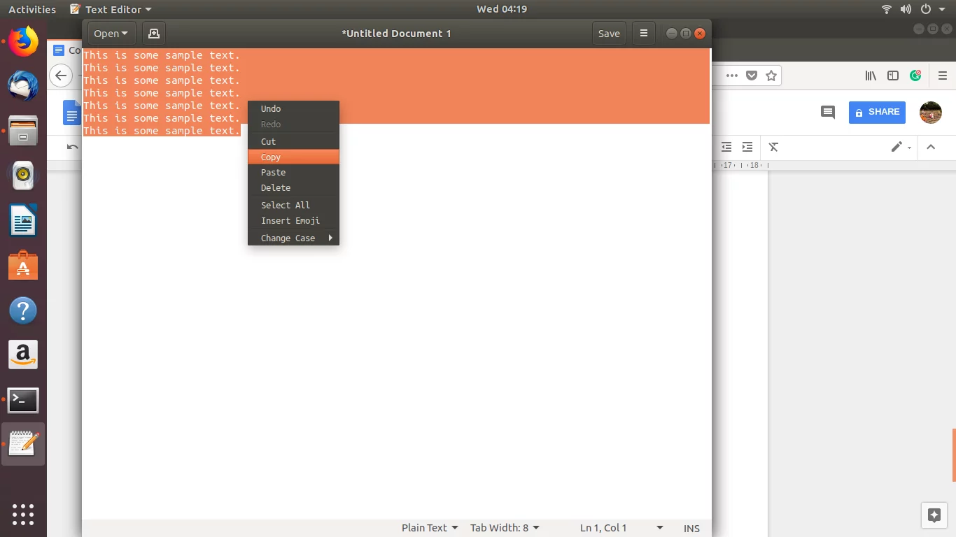 让我们假设您正在 Nano 编辑器中处理一个文本文件,并且需要将大量文本从图形文本编辑器复制到该文件。您只需从图形文本编辑器中选择文本并通过 Ctrl+C 将其复制到剪贴板即可,如下所示: