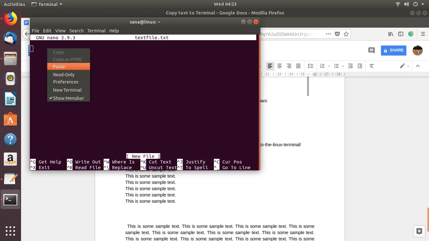然后,您可以将此文本粘贴到终端中的 Nano 编辑器文件中,方法是右键单击所需位置,然后从菜单中选择“粘贴”,如下所示: