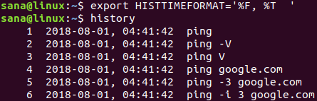现在,当您运行此命令,然后运行历史命令时,您将看到具有您在教程中设置的确切日期和时间格式的输出。