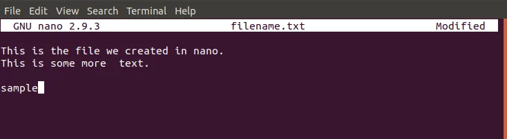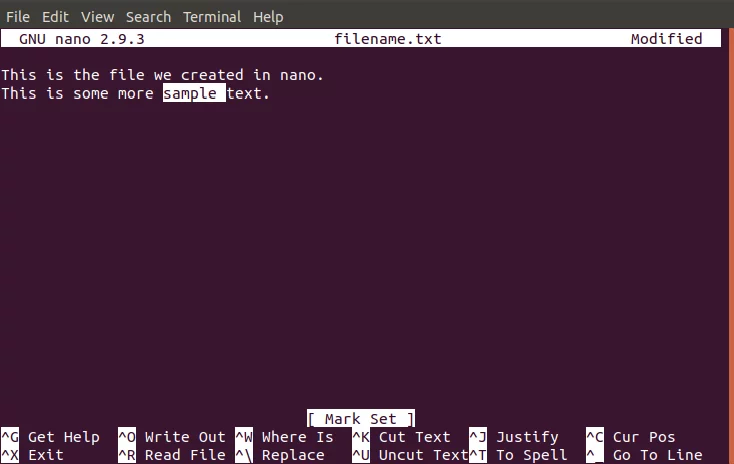 Nano 编辑器还允许您剪切一串文本而不是整行。在下面的示例中,我们将从文本中删除字符串“sample”。请将光标置于字符串的开头并按 ctrl+6 选择要剪切的字符串。这会将字符串标记为已选择;状态栏将显示“标记设置”消息。