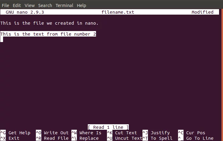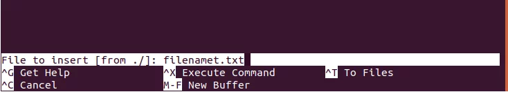 使用 Nano,您可以将一个文本文件的内容合并到另一个文本文件中。打开文件并按 ctrl+R。编辑器将询问您要在当前文件中插入其文本的文件名。您可以在下图中看到我们输入了文件名 filnamet.txt。