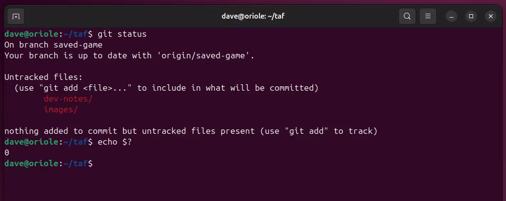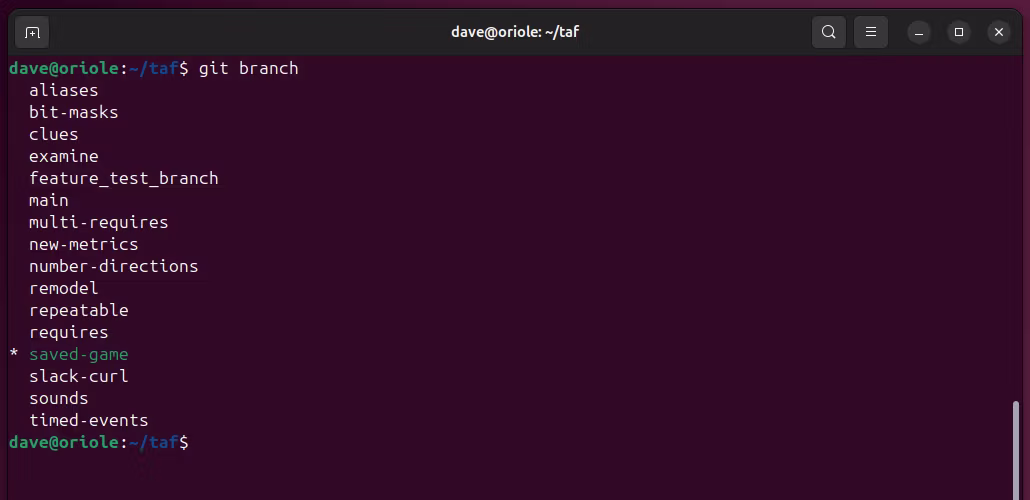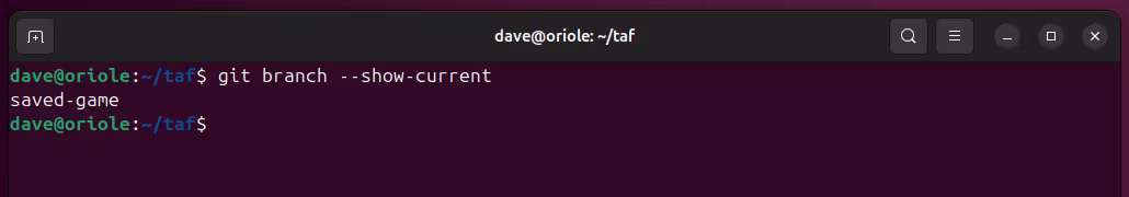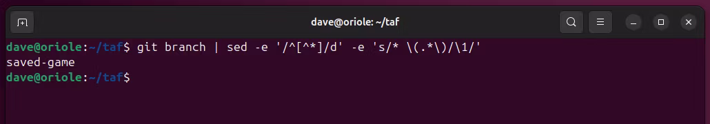 这列出了存储库中的所有分支。当前分支,保存的游戏,带有星号标记。方便的是,它是唯一带有星号的行。这意味着我们可以将 git 命令的输出通过管道传输到 sed,并使用 sed 命令的流操作功能来删除不带星号的行。对于剩下的一行,我们可以使用 sed 删除星号和空格。