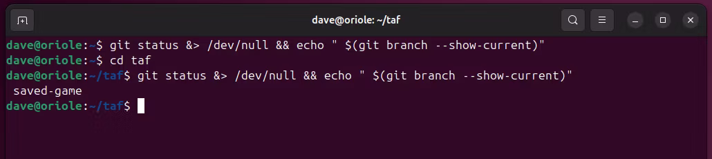 我们已经抑制了 git status 命令的所有输出,这正是我们所需要的。在不包含存储库的目录中,没有屏幕输出。在包含存储库的目录中,我们可以看到当前分支的名称。