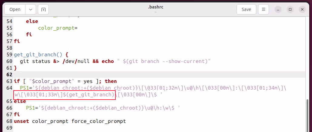 在这行下面还有另一行“PS1=”,但它要短得多。如果您阅读 if-then 块中发生的情况,您将看到一个提示用于彩色显示,另一个提示用于单色显示。如果您使用 Git,那么您就是一名程序员。您很快就能弄清楚您需要使用哪个提示。