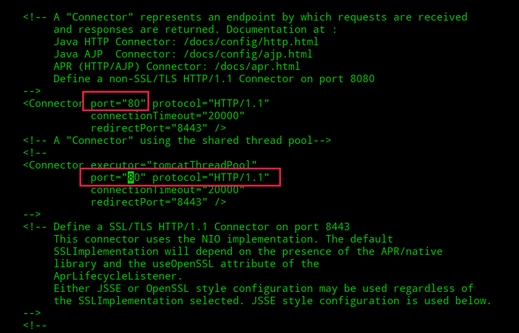 如果您想在不同的端口上运行 Tomcat,请说 80 端口。您必须编辑“/usr/local/tomcat9/conf/”中的“server.xml”文件。在更改端口之前,请确保停止使用 Tomcat 服务器。