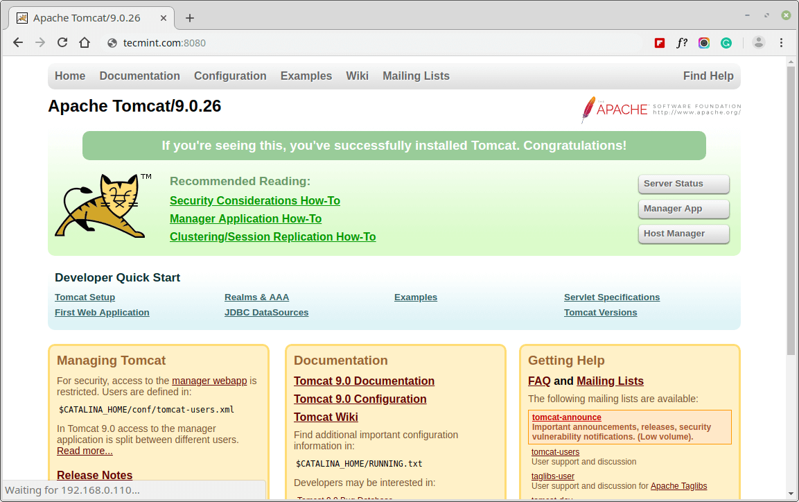 现在,要从浏览器打开 Tomcat,请使用 8080 端口转到您的 IP 或域(因为 Tomcat 始终在 8080 端口上运行),例如:mydomain.com :8080,将 mydomain.com 替换为您的 IP 或域名。