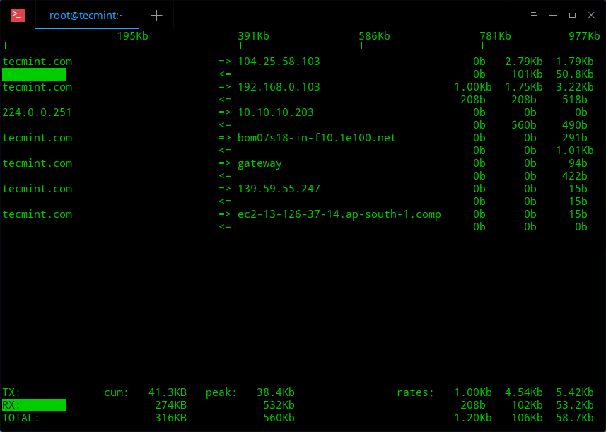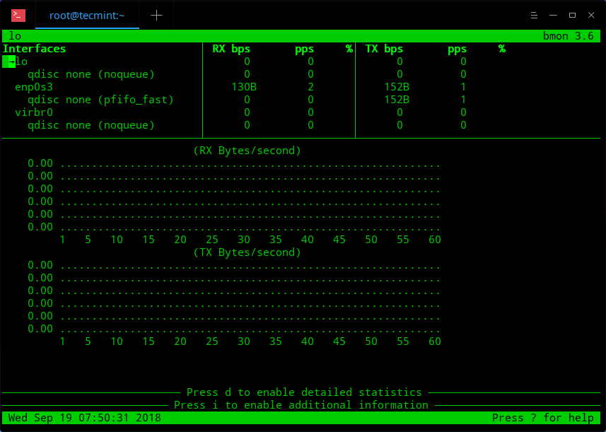 bmon 也是 Linux 中一个简单的命令行工具,用于监控网络带宽利用率和速率估计器。它捕获网络统计数据并以人性化的格式将其可视化,以便您可以密切关注您的系统。