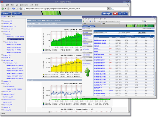 Cacti 是一个功能齐全、基于 Web 的网络绘图 PHP 应用程序,具有直观、易于使用的界面。它使用 MySQL 数据库来存储收集的网络性能数据,用于生成定制的图形。它是 RRDTool 的前端,可用于监控具有数千个设备的小型到复杂的网络。