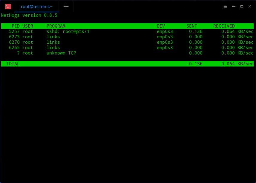 NetHogs 是一个基于文本的微型顶部工具,用于监控 Linux 系统上运行的每个进程或应用程序的实时网络流量带宽使用情况。它只是提供每个进程的网络带宽使用情况的实时统计数据。