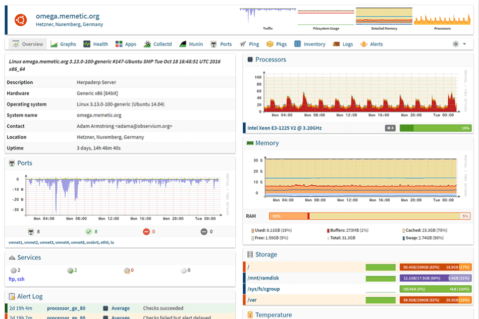 Observium 是一个功能齐全的网络监控平台,具有优雅而强大、强大且简单直观的界面。它支持多种平台,包括 Linux、Windows、FreeBSD、Cisco、HP、Dell 等,并包括设备自动检测功能。它帮助用户收集网络指标,并根据收集的性能数据提供直观的设备指标图表。
