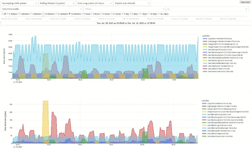 它具有基于终端的用户界面,允许用户通过各种参数轻松导航和过滤其流量历史记录,包括时间、可执行文件、sha256 哈希、可执行文件的父进程、用户 ID、本地和远程端口、本地和远程地址、甚至域。