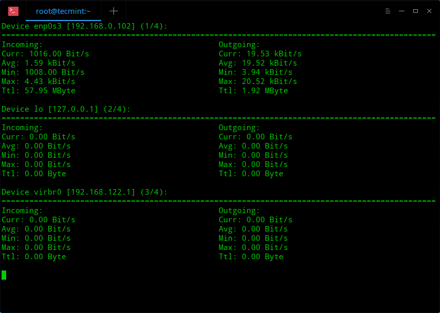 CBM 是一个小型命令行实用程序,用于在 Ubuntu Linux 及其衍生产品(例如 Linux Mint、Lubuntu 等)中以彩色输出显示所有连接设备上的当前网络流量。它显示每个连接的网络接口、接收的字节数、传输的字节数和总字节数,使您可以监控网络带宽。