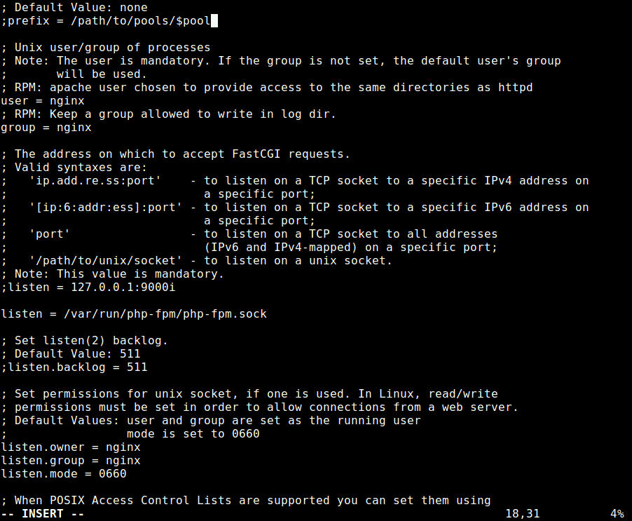 然后注释掉 listen=127.0.0.1:9000 行,并设置监听变量以监听 nginx 服务器块文件中设置的 Unix 套接字: