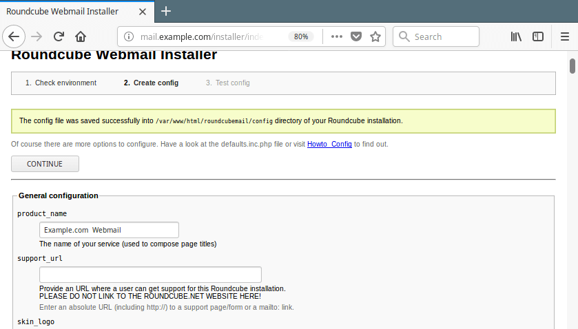 18. 您现在应该看到一条消息,显示“配置文件已成功保存到 Roundcube 安装的 /var/www/html/roundcubemail/config 目录中。”,单击继续。