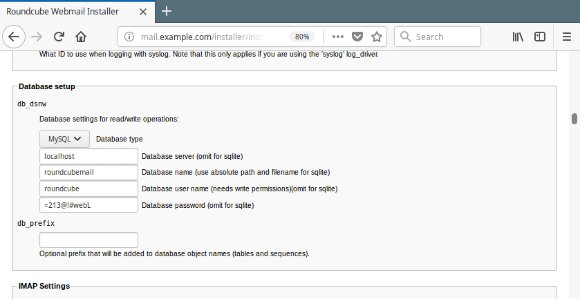 然后向下滚动到 IMAP 和 SMTP 设置,并输入您的 IMAP 和 SMTP 服务器的 IP 地址(如果是)运行 Roundcube 的同一服务器,将其保留为“localhost”,并指定其他必要的参数。