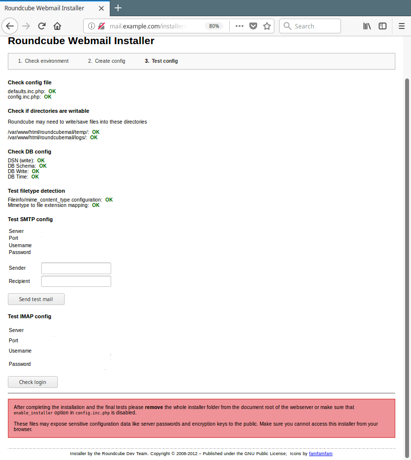 20. 接下来,从 Roundcube 根目录中删除整个安装程序文件夹(其中包含可能向公众公开服务器密码和加密密钥等敏感配置数据的文件)(或确保 config.inc.php中的enable_installer选项被禁用)。