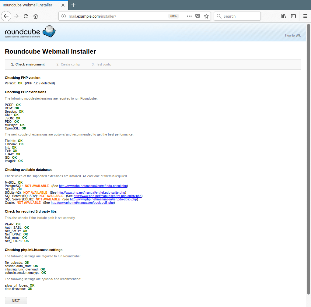 (将域替换为您在创建 Nginx 服务器块时设置的服务器名称)对于 Roundcube)来访问 Web 安装程序。如果所有 PHP 版本、扩展和 php.ini/.htaccess 设置正确,您将看到以下屏幕截图,点击下一步进入配置页面。