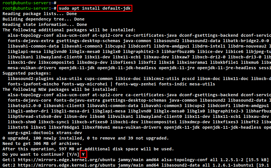 要安装 Java OpenJDK,请运行下面的“apt install”命令。系统会提示您确认安装,输入Y,然后按ENTER继续,Java OpenJDK安装就会开始。