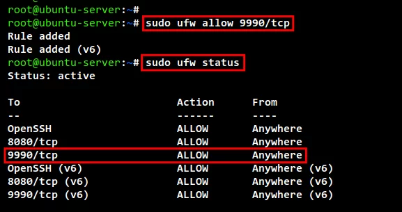 运行下面的“ufw”命令添加用于打开 WildFly 管理控制台端口“9990”的 UFW 防火墙规则。然后,检查并验证 UFW 防火墙状态。