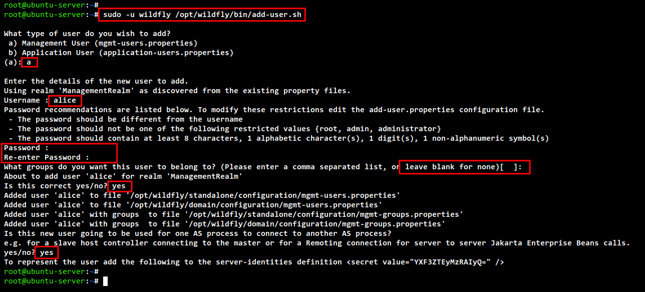 - 最后,再次输入“yes”以使新用户能够用于识别一个WildFly进程,或者您可以对此设置输入“no”。