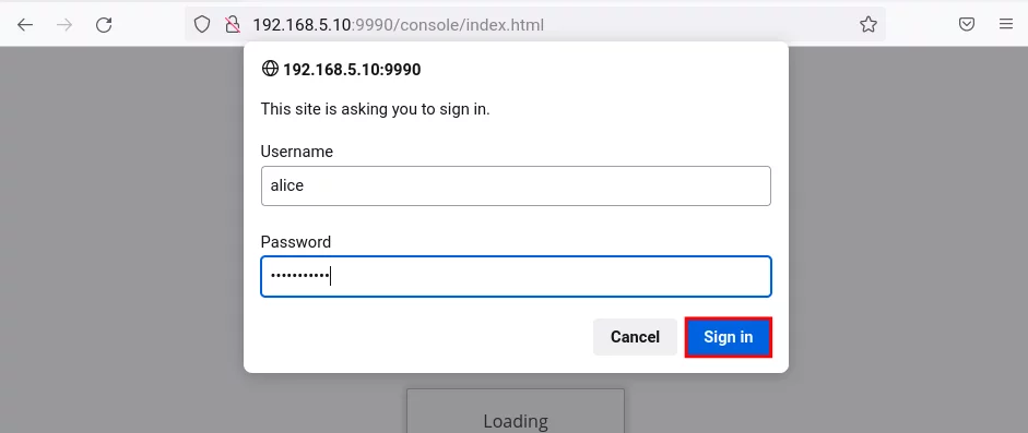 最后,返回您的网络浏览器并访问服务器 IP 地址,后跟端口“9990”(即:http://192.168.5.10:9990/)。系统将提示您输入 WildFly 管理员用户和密码。