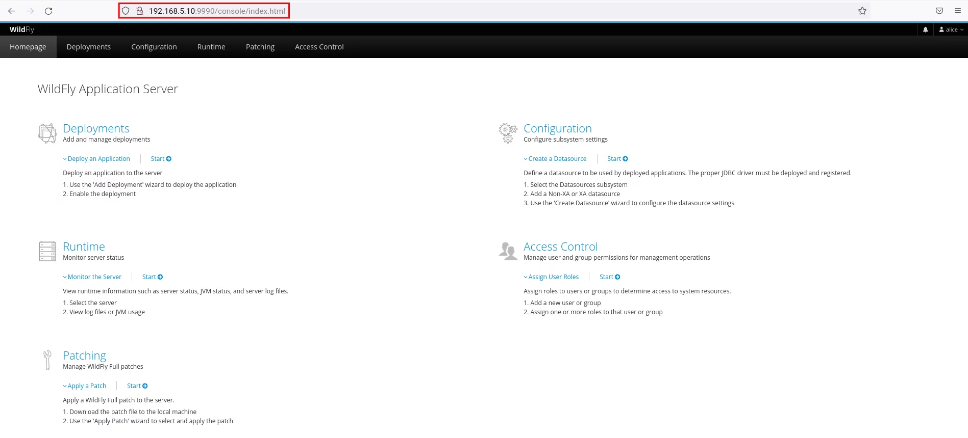 - 输入 WildFly 管理员的用户名。在此演示中,我们将使用管理员用户“alice”。