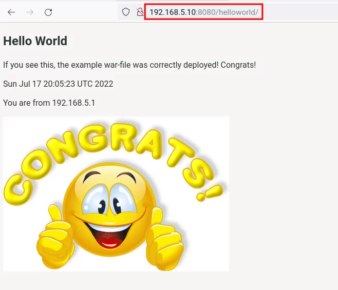 最后,返回您的网络浏览器并使用以下路径“/helloworld”访问您的服务器 IP 地址(即:http://192.168.5.10:8080/helloworld/)。您应该获得示例应用程序“helloworld.war”。