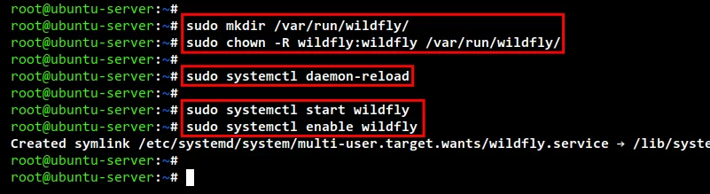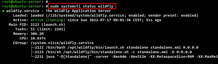 之后,使用以下“systemctl”命令启动并启用“wildfly”服务。并且“wildfly”服务将启动并运行,并且它将在系统启动时自动运行。