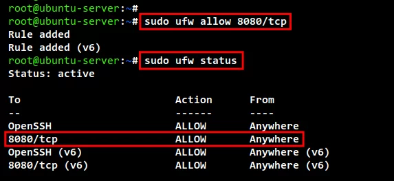 运行下面的“ufw”命令为 WildFly 打开 TCP 端口“8080”。然后,检查并验证 UFW 防火墙状态。您应该看到端口“8080”已被添加。