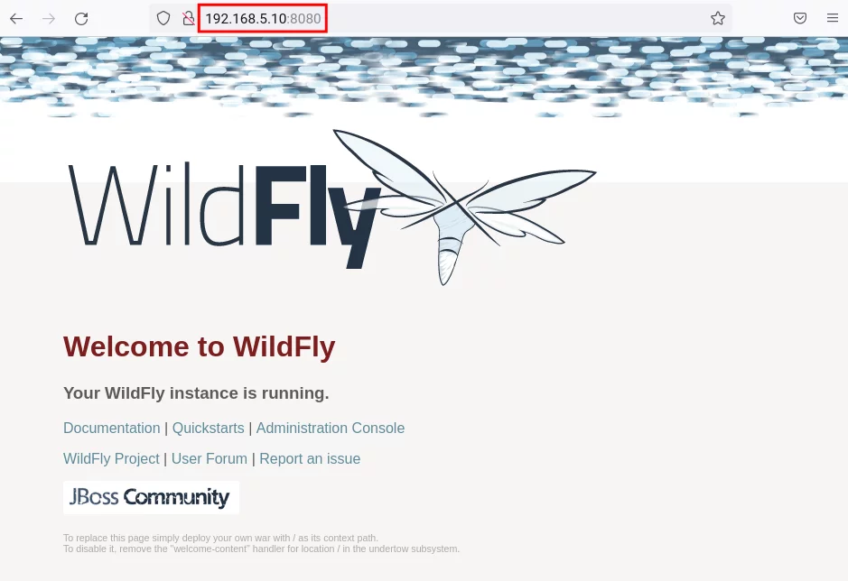 打开网络浏览器并使用端口“8080”访问服务器 IP 地址(例如 http://192.168.5.10:8080/)。您将看到 WildFly 的默认 index.html 页面。