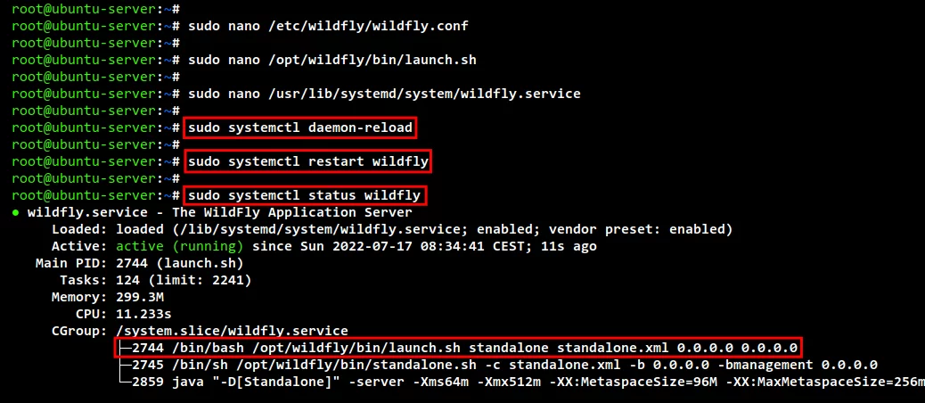 现在运行下面的“systemctl”命令来重新加载 systemd 管理器并应用新的 WildFly 服务文件。
