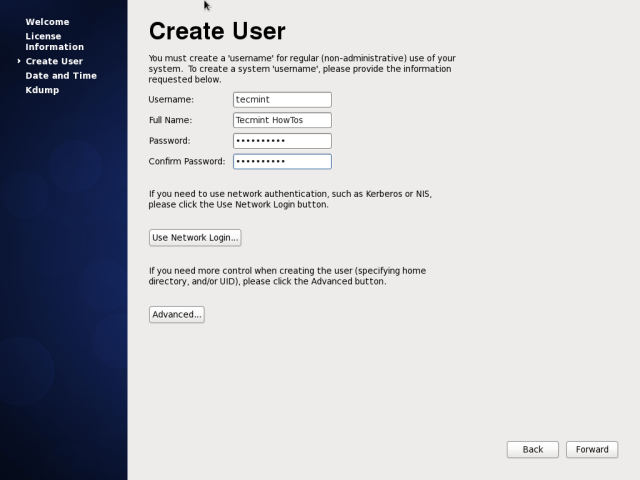 18.现在创建一个额外的用户,输入用户名、全名并为其设置密码并确认密码,然后单击前进继续。
