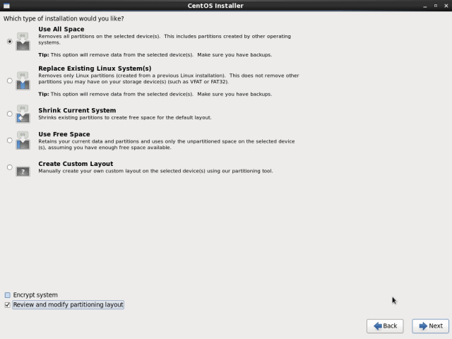 11. 接下来,您需要定义所需的安装类型。仔细阅读选项的描述并选择合适的选项。如果要使用整个磁盘空间,请选择使用所有空间,但要执行自定义安装,请选择创建自定义布局。