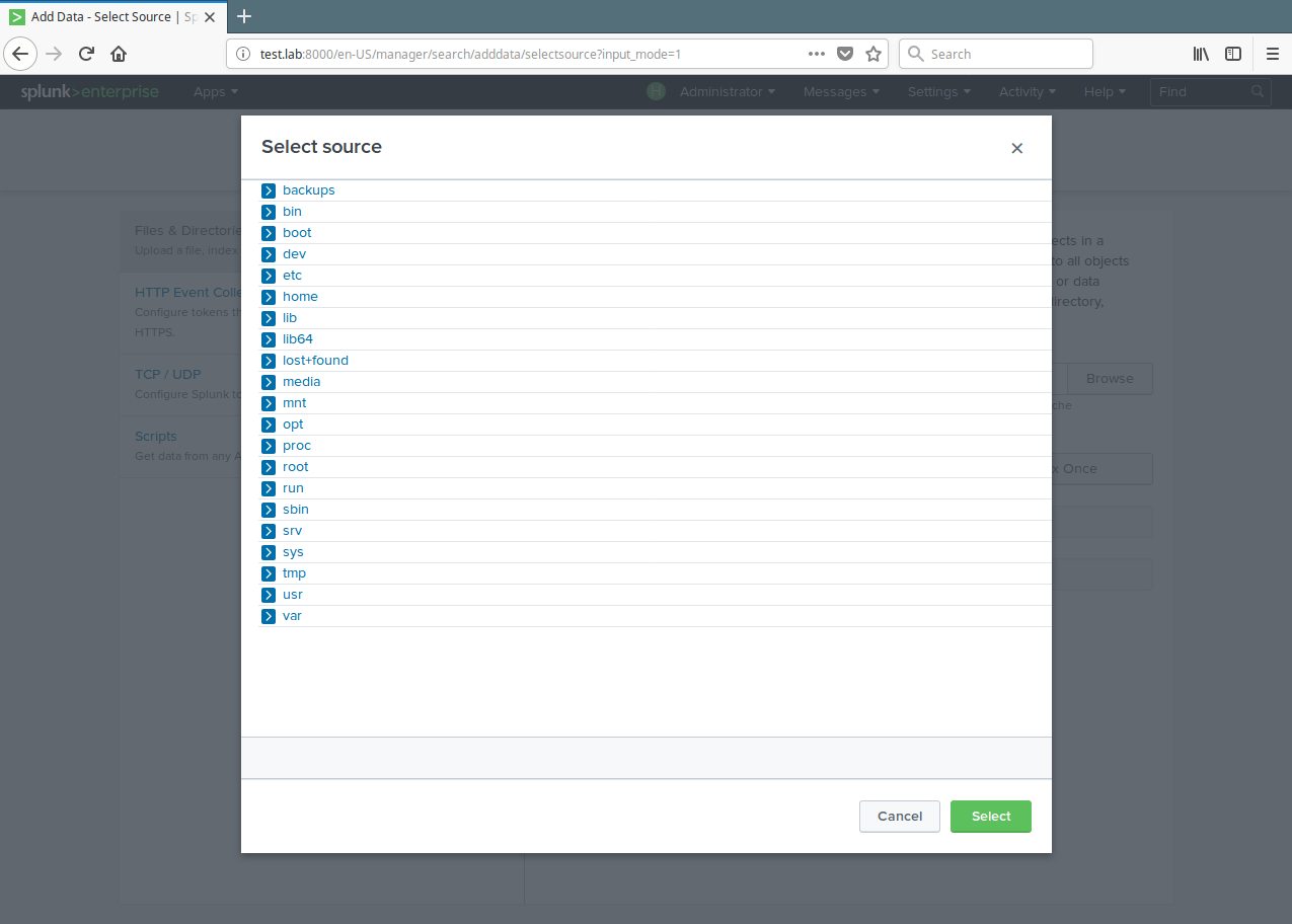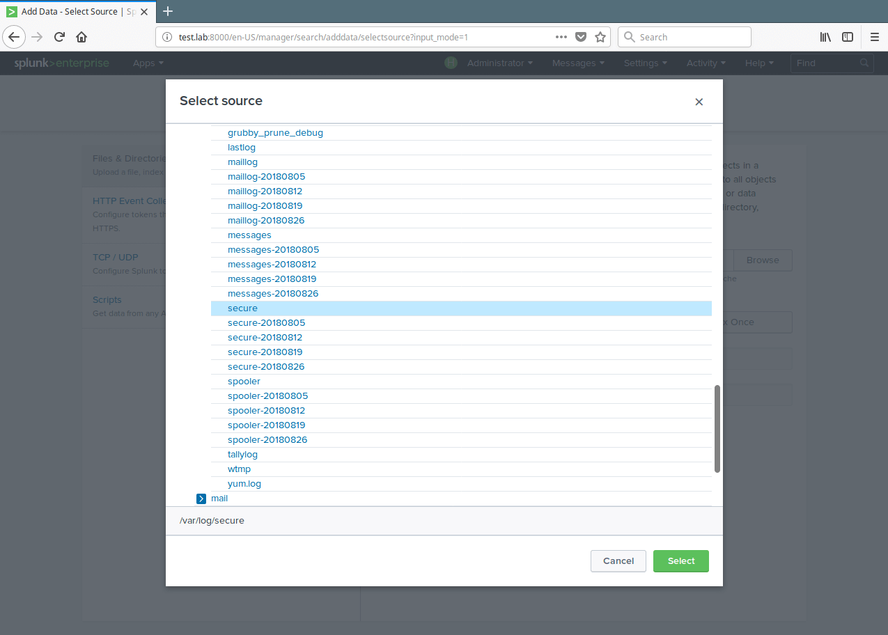 目录中的目录列表,导航到您要监控的日志文件 (/var/log /secure),然后单击选择。
