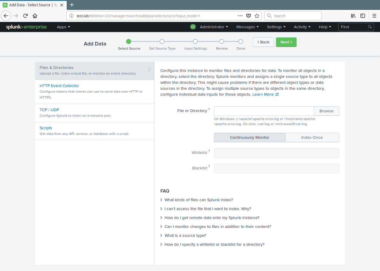 7.成功登录后,您将登陆splunk管理控制台,如下图所示。要监视日志文件(例如 /var/log/secure