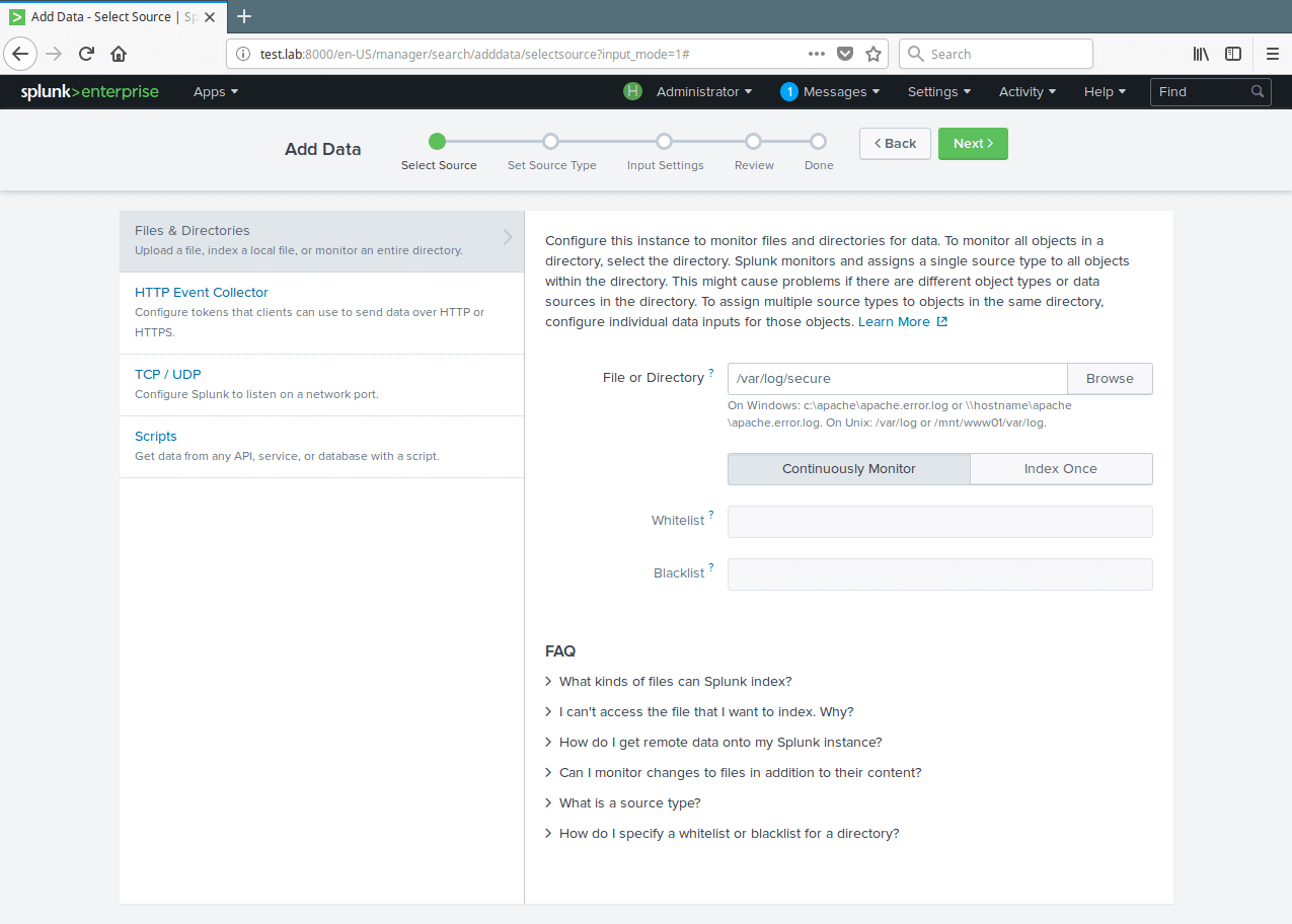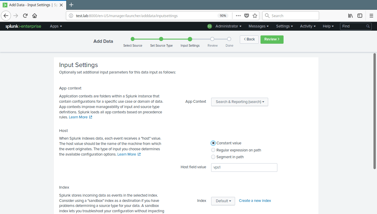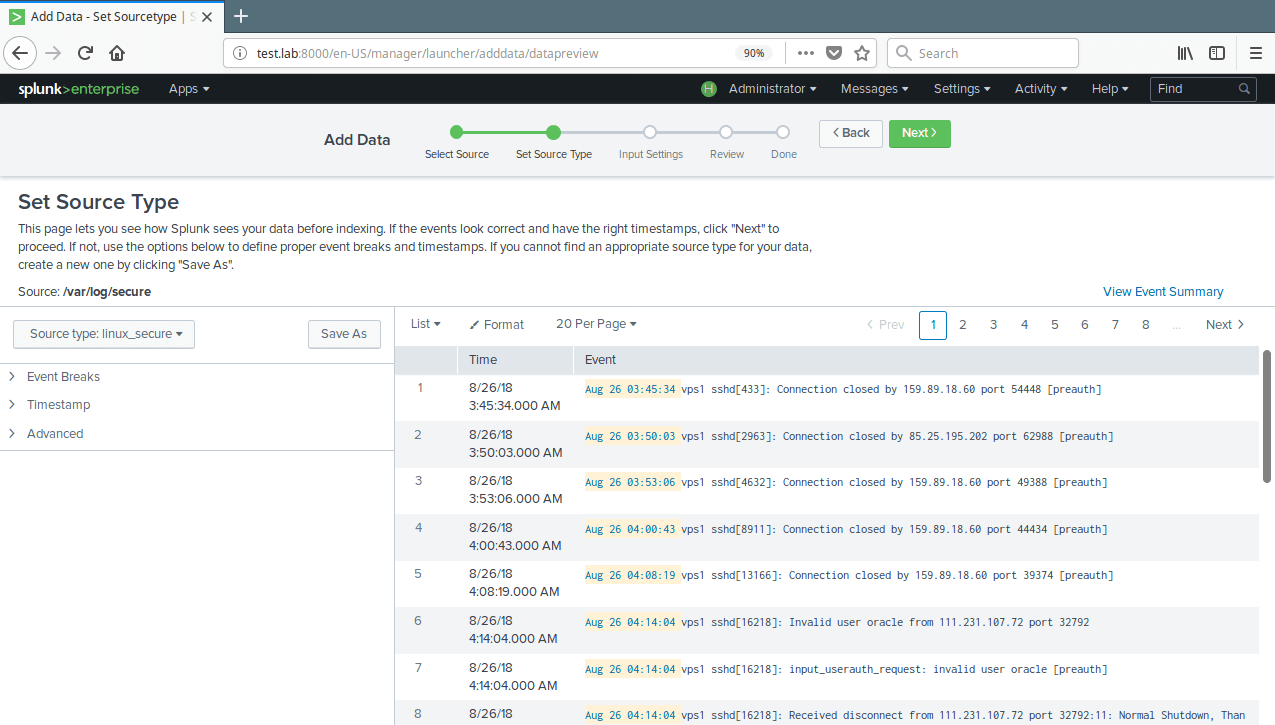 13. 接下来,设置数据源的源类型。对于我们的测试日志文件(/var/log/secure)
