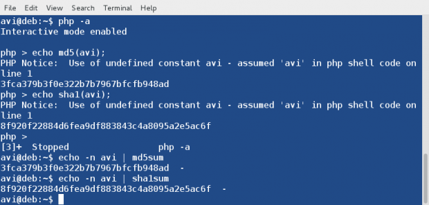 例如,让我们在 php shell 上检查字符串(例如 avi)的 md5sum 和 sha1sum,并将结果与 bash shell 生成的 md5sum 和 sha1sum 进行交叉检查。