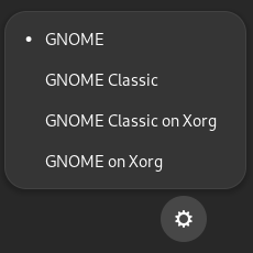 在 GNOME 上,如果您想切换并尝试其他系统,请在登录屏幕上单击您的用户名,然后单击显示屏右下角的齿轮图标。