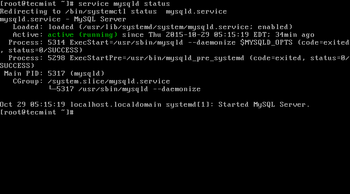 Oct 29 05:15:19 localhost.localdomain systemd[1]: Started MySQL Server.