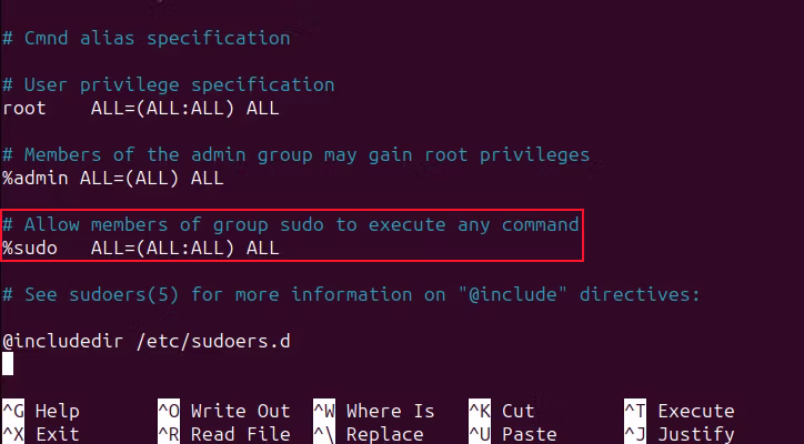 sudo visudo 命令打开编辑器并加载“/etc/sudoers”文件。向下滚动,直到看到类似于“允许 sudo 组成员执行任何命令”的条目,然后记下组名称。