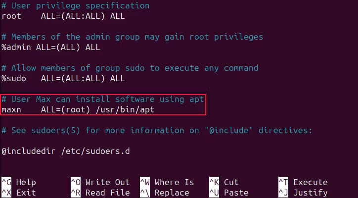 # User Max can install software using aptmaxn ALL=(root) /usr/bin/apt