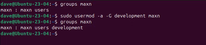 要将 maxn 添加到开发组,我们使用 -a(追加)和 -G(补充组)选项,名称为我们将其添加到的组。我们将在前后使用groups命令,以便我们可以看到进行了哪些更改。