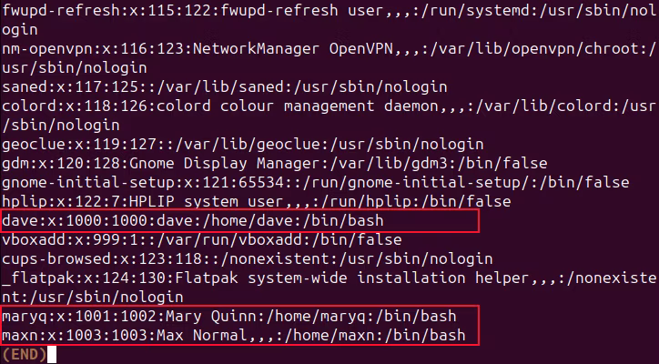 我们可以使用 less 来查看“/etc/passwd”文件的内部,但它显示了所有系统和进程“用户”帐户以及实际的有机人员使用的帐户。